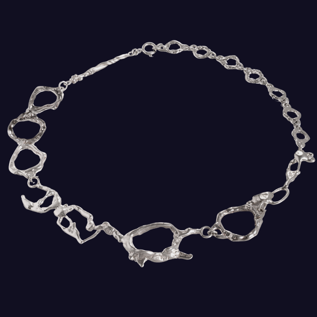 The Chaos necklace is a heavy-weight design crafted from freeform molten silver pieces.