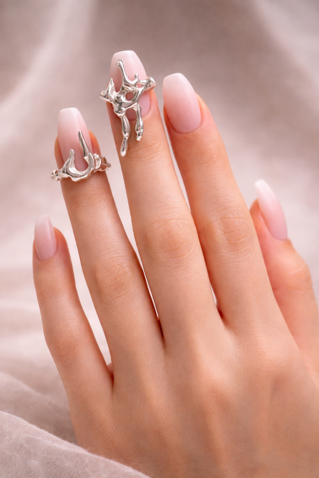 the thread ring is shaped like molten silver in motion, medium in weight and designed to shift between a midi ring, nail ring, or ear cuff.