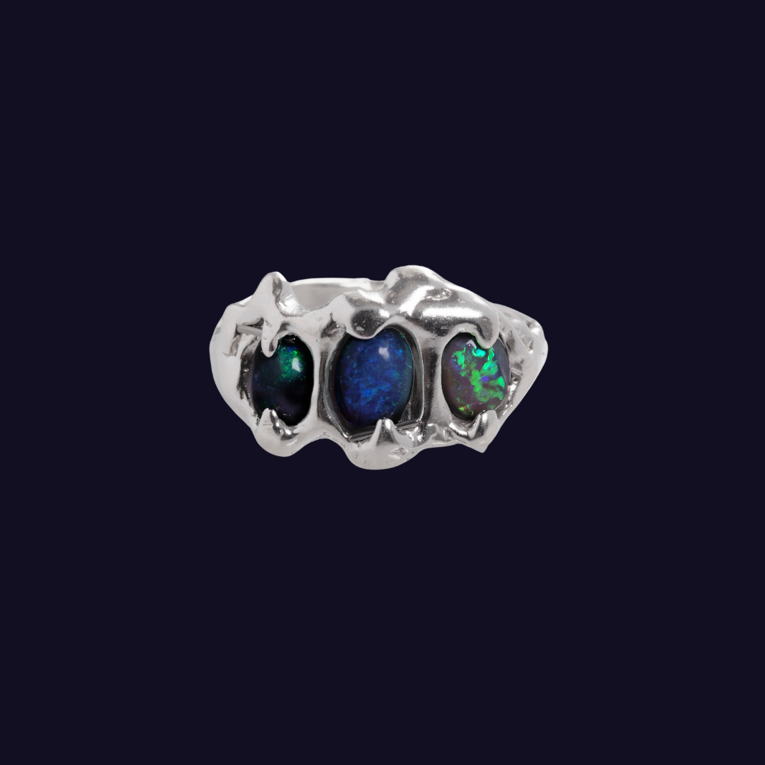 Triplet ring is a freeform ring that includes a claw setting with three Ethiopian or Australian Opals.